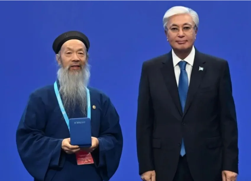 9月17日,在第八届世界和传统宗教领袖大会期间,哈萨克斯坦总统托卡耶夫向中国道教协会会长李光富授予二级友谊勋章,表彰促进全球对话与和平的卓越贡献。(中国道协供稿)